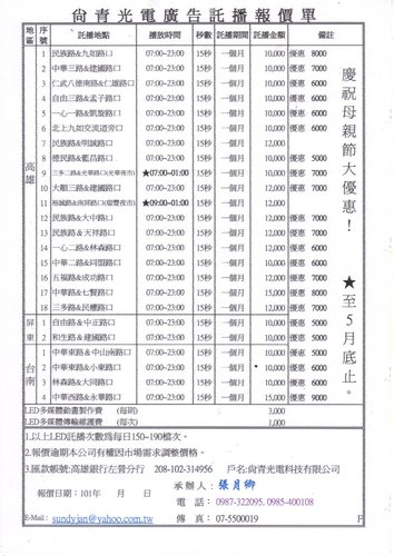 尚青光電科技有限公司 託播專線:會計張月卿0987-322095(台哥大) 0985-400108(亞太) E-MAIL:sundyjan@yahoo.com.tw 網址:http://blog.xuite.net/sundyjan/blog |